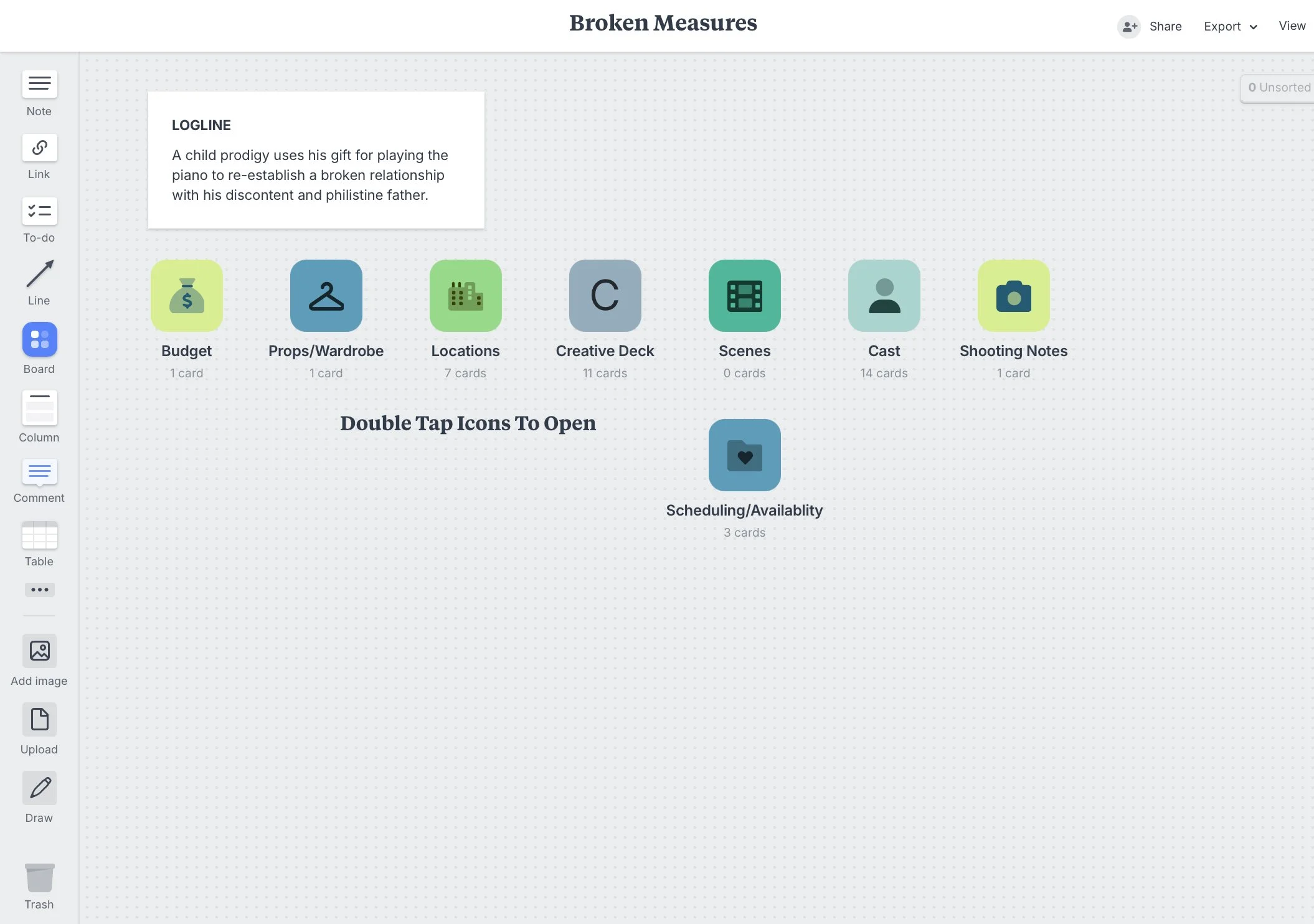 You will also notice a tab labeled “Creative Deck.” This is a visual representation of the film that conveys the look and feel of the story. Here is the one that I created for Broken Measures.