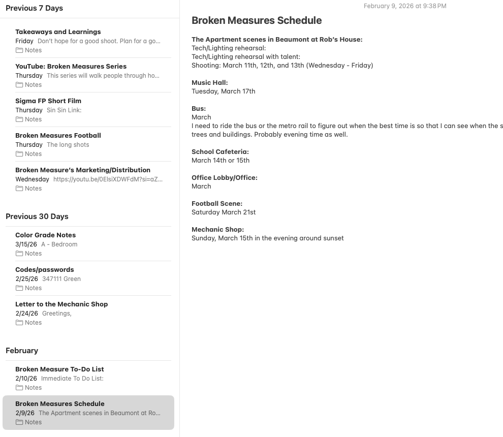 The first image is my notes app on my iPhone. I imagine that Android users have something similar. If you look closely, you will notice that the left column is filled with note topics for the movie. Such as, Broken Measures Shooting Schedule, Broken Measures Football Scene, Broken Measures Marketing and Distribution, and so on. You will also notice that I’m already thinking about visiting the shooting locations for a tech scout, rehearsal with the actors, etc.